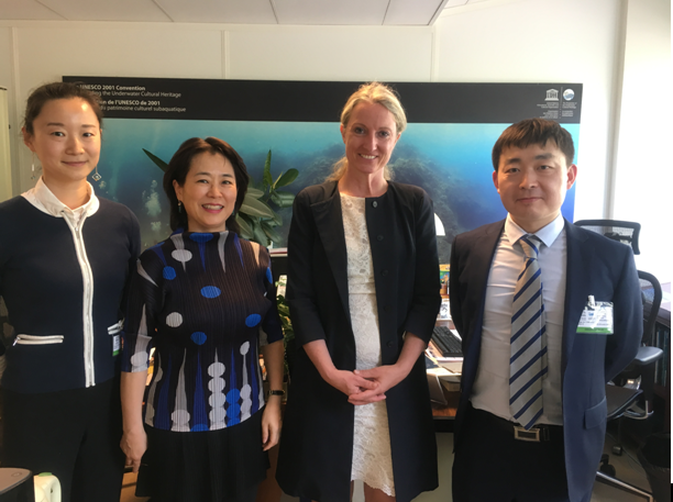 4月23日中午,《水下文化遗产保护公约》秘书处Ulrike Guerin女士专门会间了中国代表团,听取了我国水下文化遗产保护与法律的情况。王铮副处长向Ulrike 女士介绍了中国近几年水下文化遗产参加国际交流合作的情况以及中国希望跟公约秘书处进一步合作保护水下文化遗产的想法。刘丽娜介绍了中国《水下文物保护条例》(征求意见稿)的修订的情况以及中国水下文化遗产法律保护与国际公约的关系。Ulrike Guerin女士非常高兴中国在水下文化遗产在国际交流领域取得的可喜成果,肯定了中国对水遗法律保护的重视。她特别指示希望能跟中国在水下考古乐动(中国)、法律等方面提供帮助或进一步合作,并表示会全力支持中国水下遗产保护工作。