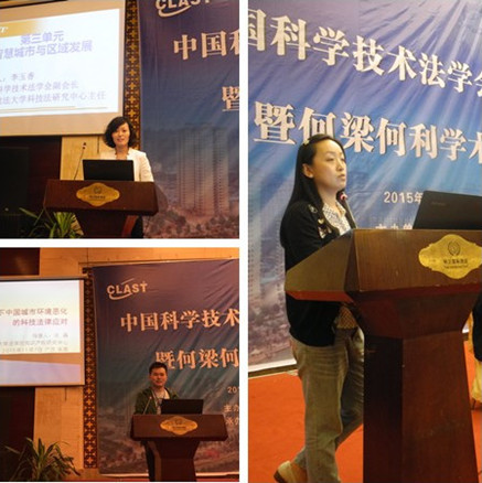 首先,法学院知识产权研究中心周方副教授、李晓鸣讲师、张磊博士作为法学院科技法学研究团队的代表,向2015年中国科学技术法学会年会进行主题汇报,报告的题目依次为《一带一路战略实施中的知识产权信息国际合作机制研究》、《完善我国外籍人士科学技术奖励制度的对策研究》、《治理学视野下城市环境恶化的科技法律应对》。三人的主题报告在大会上产生良好效果,形成了大会积极围绕讨论的主题内容,受到与会同行专家学者的一致好评。