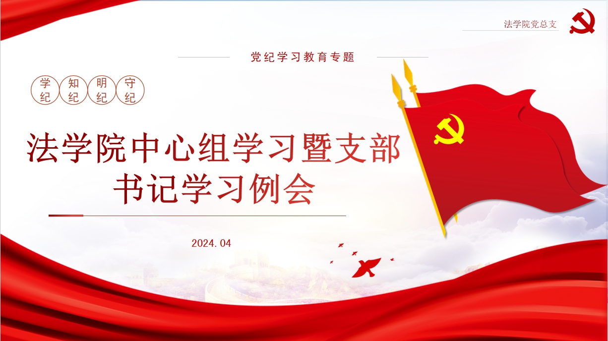 4月23日下午,法学院党总支召开中心组学习暨支部书记学习例会,深入学习《中国共产党纪律处分条例》。法学院党政班子成员、党总支委员、各教工支部书记参加会议,法学院党总支书记王保民主持会议。