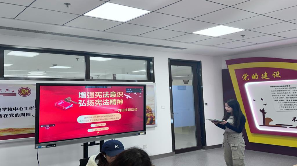 活动伊始,硕4198党支部书记杨凤作题为“增强宪法意识 弘扬宪法精神”的主题分享。她深入剖析了宪法在我国法律体系中的核心地位,阐释了宪法精神对于构建法治社会的重要意义,并鼓励广大党员同志在日常学习与实践中自觉维护宪法权威。