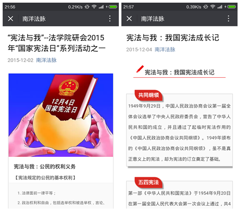 为了配合“国家宪法日”系列主题活动的顺利开展,乐动手机版法学院研究生会在院党总支、团工委的指导下,以“宪法与我”为主题,不断创新宣传载体,探索宣传方法,通过官方微信平台“南洋法脉”等新媒体,结合传统的发放传单等方式,积极推介“国家宪法日”相关内容,宣传法学院开展宪法学习宣传教育活动的实际情况,取得了良好的宣传效果。