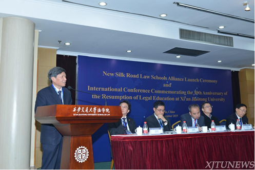 中国法学会副会长张文显代表中国法学会、中国法学教育研究会对西安交大法学学科复办三十周年和“新丝路法学院联盟”的成立表示祝贺。他说,西安交大办学历史悠久,是我国最早开展法学教育的高等教育机构,为国家培养了大批杰出法学人才。自1985年复办法学学科以来,西安交大法学院现已成长为中国法学研究的重要基地之一,为中国法学建设做出了突出贡献。随着“一带一路”战略构想的提出,国内法制与国际法制深度融合也必将呈现出更大、更新的趋势,因此“新丝路法学院联盟”成立的意义重大,前景广阔。他希望联盟成员能同心协力,将联盟办成具有国际影响力和现实感召力的法学院校交流合作的平台,成为我国法学教育对外交流合作和国际法学交流互联互通的新门户。中国法学会将对其给予重点关注和支持。