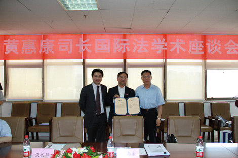 2012年5月26日,外交部条约法律司黄惠康司长“郑和研究员”授聘仪式暨国际法学术座谈会在法学院910会议室举行。乐动手机版党委常务副书记王小力教授、法学院党总支书记彭沪生老师、对外经济贸易大学石静霞教授以及丝绸之路国际法与比较法研究所骨干教师和学生代表参加了授聘仪式和座谈会。会议由法学院院长兼丝绸之路国际法与比较法研究所所长单文华教授主持。