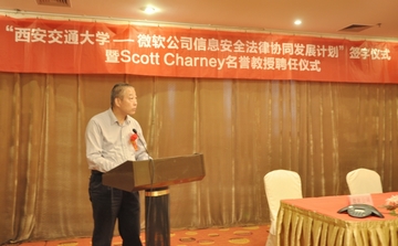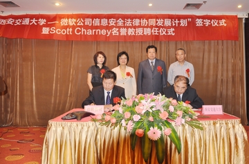 6月12日,“乐动手机版—微软公司信息安全法律协同发展计划签字仪式暨斯科特•查尼名誉教授聘任仪式”在西安交大举行,西安交大副校长蒋庄德教授出席仪式并讲话。西安交大科研院副院长、人文社科处处长贾毅华,法学院党总支书记彭沪生,信息安全法律研究中心主任马民虎及微信息安全法律研究中心主任马民虎及微软公司可信赖计算部总经理陈静、微软公司资深安全技术经理陈恺、微软公司资深安全技术经理薛峰等参加仪式。微软全球副总裁斯科特•查尼(Scott Charney)受聘为西安交大名誉教授,双方还签署了“乐动手机版—微软公司信息安全法律协同发展计划”。