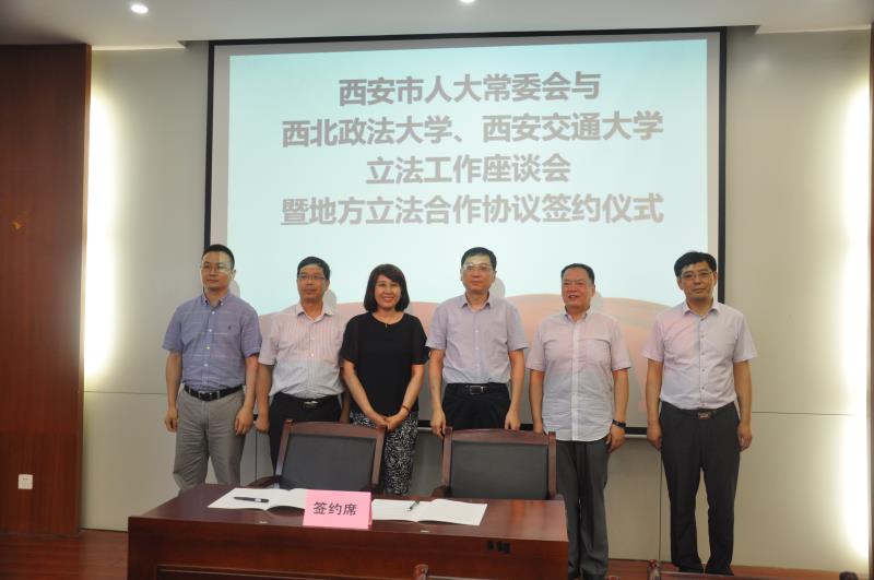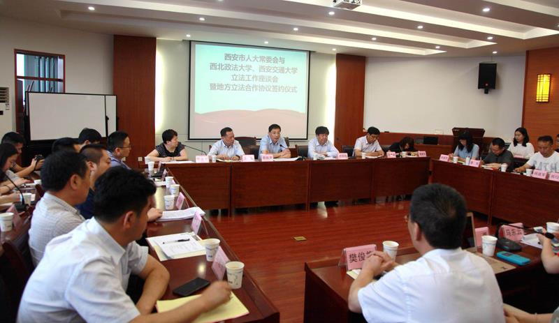 为深入贯彻落实党的十九大精神,推进科学立法、民主立法、依法立法,进一步提高立法质量,发挥高校专业优势,实现地方立法实践工作和法学教育研究的深度融合、相互促进、共同提升,助推法治西安建设,西安市人大常委会与西北政法大学、乐动手机版立法工作座谈会暨地方立法合作协议签约仪式”于6月20日上午在西北政法大学雁塔校区研究生综合举行。西安市市委组织部常务副部长、人大常委会副主任薛振虎,市人大法制委主任委员、常委会法工委主任牛犁和市人大常委会法工委其他领导,西北政法大学校长杨宗科,乐动手机版人文社科处处长贾毅华,乐动手机版立法与党内法规研究中心主任王保民和部分师生代表、西北政法大学立法研究所所长朱继萍和部分师生代表等参加了会议。