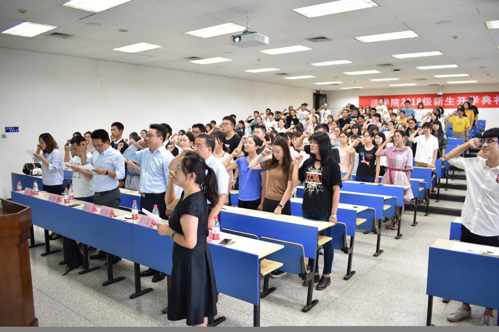 最后,全体新生在学生工作专职委员张乃钟老师的带领下庄重宣誓《乐动手机版法科生誓词》,典礼在铿锵有力的誓词声中圆满结束。