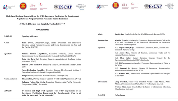 2021年3月30日下午,“WTO投资便利化促进发展谈判区域高层圆桌会议:亚太经济体的视角”在泰国曼谷成功举行。乐动手机版法学院院长单文华教授应邀参加并作“WTO投资便利化谈判所面临的挑战”的大会发言。此次会议由联合国亚洲及太平洋经济社会委员会(亚太经社会ESCAP)和世界经济论坛(WEF)、联合国国际贸易中心(ITC)、德国发展研究院(DIE)、东南亚国家联盟(东盟ASEAN)联合举办,参加会议的包括亚太地区各国商务部长、驻WTO大使、主要相关国际机构代表、投资促进和私营部门代表以及本领域的领军学者代表。会议的主旨是为争取WTO投资便利化谈判在年内取得重大进展加强共识。