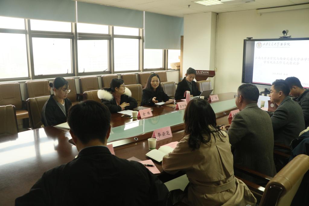 随后,双方针对法学毕业生就业工作普遍存在的重难点问题进行了交流。刘蔓琦书记介绍了云南大学法学院学生就业工作的困难点,他指出生源特点、家庭经济情况、用人单位隐形性别歧视、学生就业观念传统等情况制约了就业工作的开展,导致学生就业率偏低。他对交大法学院的就业工作表示赞扬,指出我院就业工作呈现系统化、提前化、精细化等特点,许多就业帮扶举措值得学习。张乃钟指出,我院非常重视学生就业工作,工作中形成了本科生和研究生就业工作“一体化”管理服务机制,在学院领导下以学生工作专职委员为主干,教学副院长、兼职辅导员、研究生导师和科研团队以及本科生班主任、学业导师为补充的就业工作队伍。在就业信息发布、就业经验交流、就业指导帮扶、实习平台搭建、校友资源等方面合理配置,精准发力,努力确保每一名毕业生顺利就业。特别是2020年法学院研究生毕业生在基层选调生,世界五百强企业就业等重要指标超额完成学校目标任务,取得建院13年以来历史最好成绩。学院就业助理丛珊也从毕业生角度对我校选调生考试温馨乐动(中国)以及学院“管家式”的就业精准指导和帮扶等方面分享了自己的心得和感受。