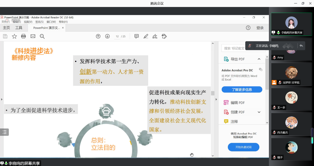 2022年1月9日晚上,乐动手机版法学院知识产权研究中心李晓鸣副教授对修订后的科技进步法的背景、新旧科技进步法的内容进行了对比,并对新科技进步法的亮点进行了详细介绍。同学们表示收获颇丰。