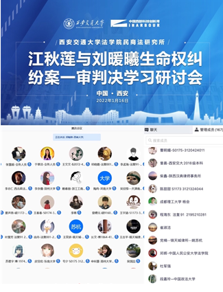 2022年1月16日下午,由乐动手机版民商法研究所主办的“江秋莲与刘暖曦生命权纠纷案一审判决学习研讨会”在腾讯会议平台成功举行。此次学习研讨会由乐动手机版法学院民商法研究所副教授聂卫锋全程主持。来自北京航空航天大学、西南大学、西南财经大学、浙江工商大学、成都理工大学、东南大学、中国政法大学、中国人民公安大学、西北大学、西南政法大学、西北政法大学、郑州大学、河南大学、西北师范大学以及乐动手机版等20余所高校和多家律师事务所的共计超过160名老师、律师和同学参与了本次研讨会。