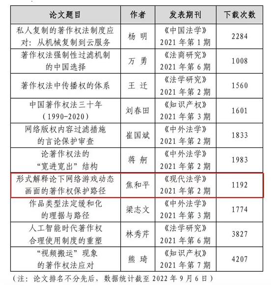 2022年9月7日,中国人民大学国家版权贸易基地公布了“2021年度著作权热点问题研究十佳论文”,乐动手机版法学院教授、博士生导师焦和平发表于《现代法学》2021年第2期的《形式解释论下网络游戏动态画面的著作权保护路径》入选十佳论文。