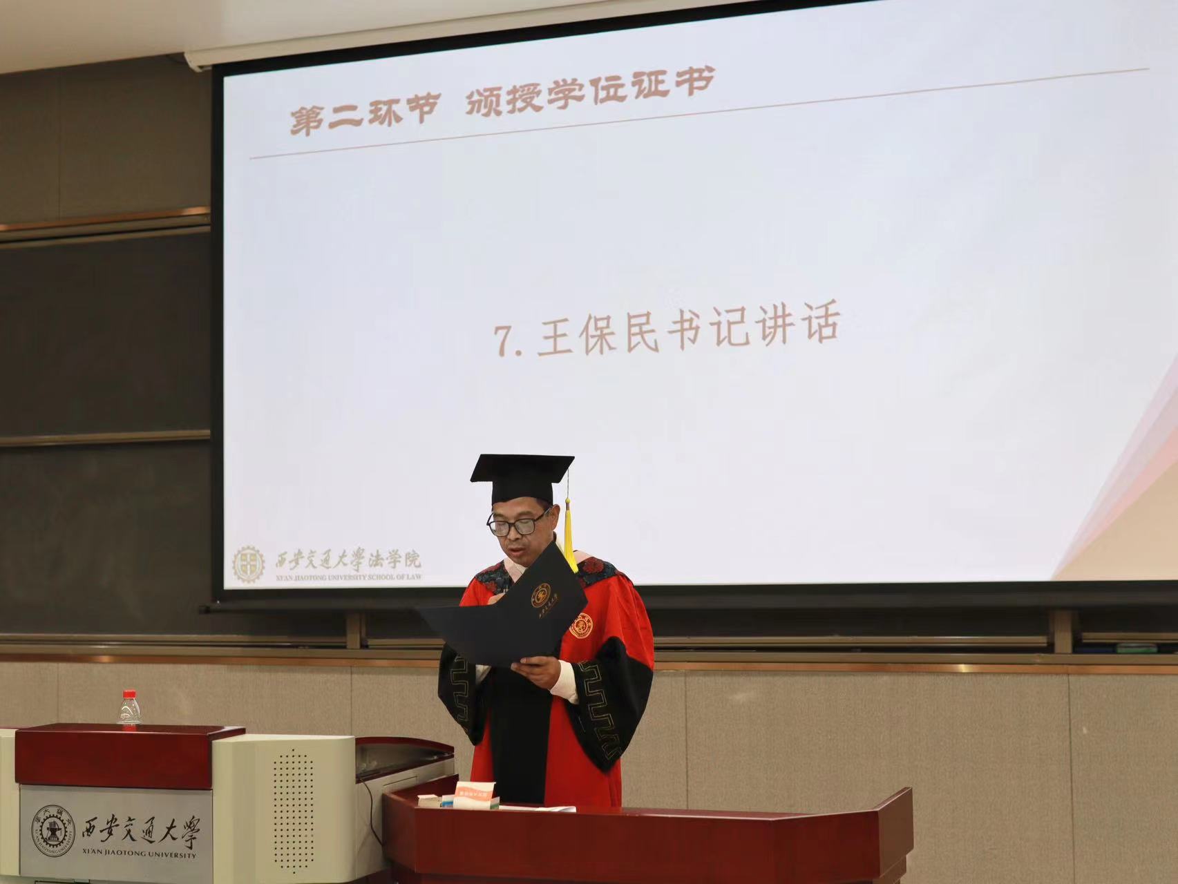 7月2日上午,乐动手机版法学院2023届学生毕业典礼暨学位授予仪式在创新港校区涵英楼5-1W103教室隆重举行。法学院党总支书记王保民教授、马治国教授、副院长丁卫副教授、学生工作专职委员张乃钟老师、教师代表王玥副教授、学院教务老师、辅导员老师、学生代表、家长和朋友们共同见证了这一特殊的时刻,并共同庆祝着毕业生们的辛勤付出和取得的成就,法学院2023届本、硕、博毕业生参加典礼。本次典礼由法学院辅导员路一飞老师主持。