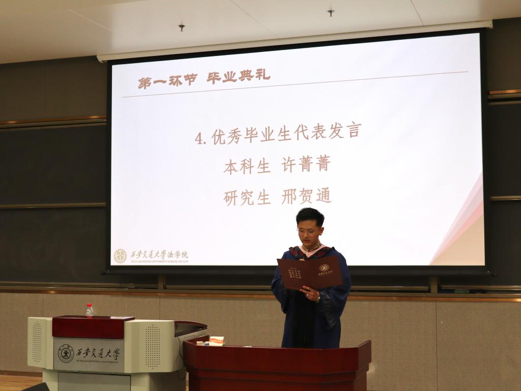 本科毕业生代表许菁菁、研究生毕业生代表邢贺通代表法学院2023届全体毕业生,分享了毕业感悟。“数载励志求学,一朝鲲鹏展翅”,毕业生们即将离开学校、步入社会,两位学生代表一同回忆了在法学院度过的难忘时光,表达了对母校的真挚感谢,对老师的感恩和对同学的不舍,抒发了对学校、学院的祝福和对未来的展望。