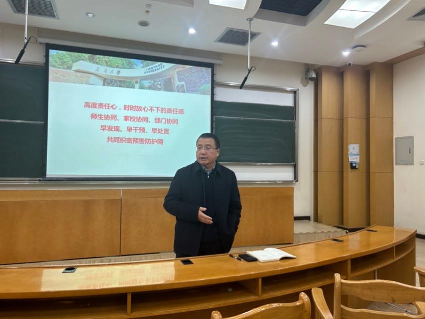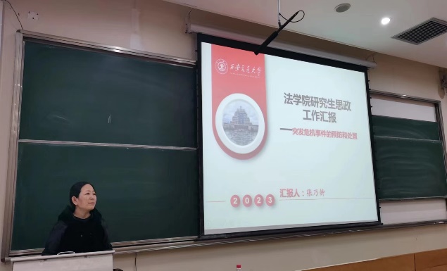 学生工作专职委员张乃钟老师汇报了法学院在校研究生基本情况、思政工作队伍及思政教育情况,通过案例讲解面对突发危机事件的预防和处置。结合多年学生管理工作经验,给出研究生导师协同工作建议,倡导“师生协同、家校协同、部门协同,早发现、早干预,共织预警防护网”。