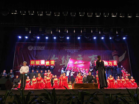 “向前进!向前进!西迁气势不可阻挡!向前进!向前进!朝着西迁的方向!”随着全体合唱队员的齐声演唱,整个合唱队伍变换成“XQ(西迁首字母)”和“60”的造型,一面写有“西迁!想科学技术进军!”旗帜迎风飘扬,将现场氛围带至顶点,瞬间点燃了全场观众的激情。大树西迁,饮水思源,在“到祖国最需要的地方去!”的誓言中展现了新一辈法学院与化工学院青年学子的拳拳报国情。