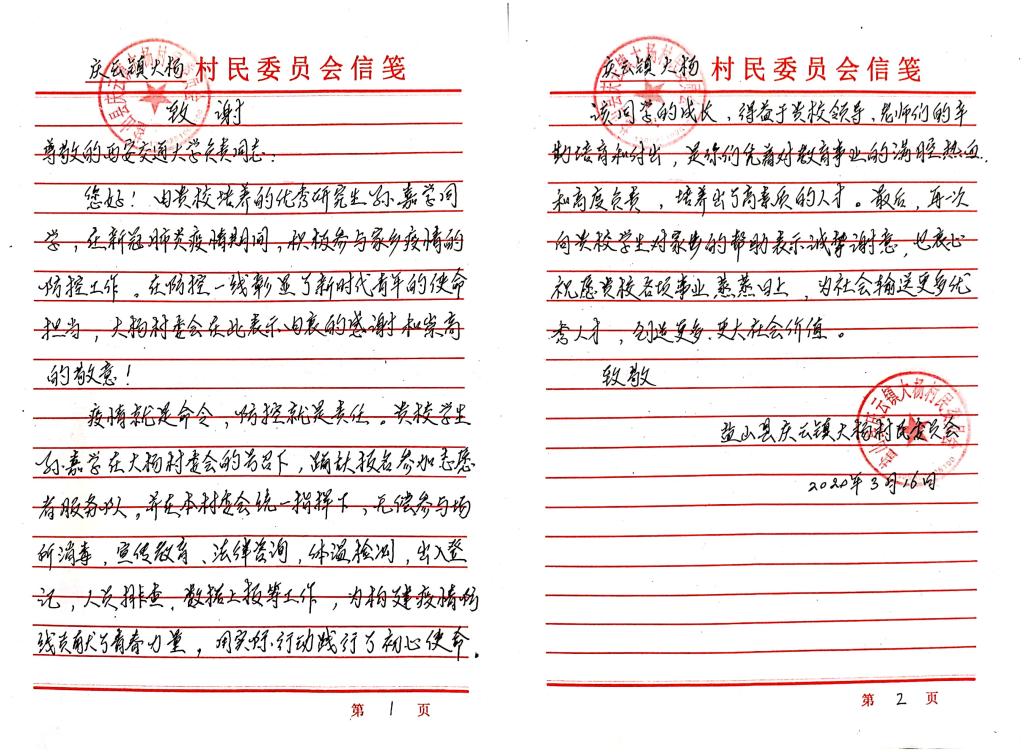 近日,一封特殊的来信悄然落至交大。西交法学院学生——孙嘉学在家乡疫情防控攻坚战中不仅身体力行做好各项基础工作,更发挥自身专业为群众普及相关法律知识,为控制疫情贡献青春力量。庆云镇大杨村特向乐动手机版邮寄了一封手写感谢信,字里行间饱含对交大领导、老师的真挚谢意。