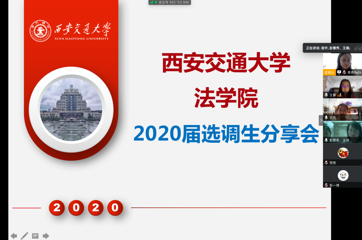 突如其来的疫情改变了2020届毕业生的就业计划和安排,给毕业生顺利就业造成了巨大的压力。对此,法学院高度重视毕业生就业情况,并结合自身专业特点和学生就业意向,积极开展学生就业指导工作,及时询问关怀学生的就业情况。在选调生选拔中,我院今年超额完成学校的指标,取得了良好的成绩。6月9日晚,法学院举办了2020届选调生就业经验交流分享会,邀请了法学院王恬、王璐、彭慧秀和王慕四位优秀的选调生在线分享就业经验,为创新港的研究生答疑解惑,帮助学生提早统筹就业安排,以更好应对未来工作和行业需求。本次分享会由法学院研究生会副主席苗青主持。