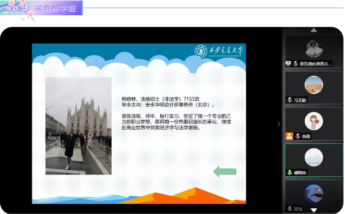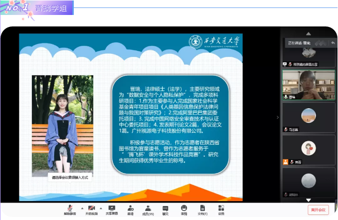 2020年6月20日晚,法学院举办了就业工作分享会,邀请了法学院晋瑞、徐佳文和熊晓林三位成功签约心仪就业单位的毕业生在线分享就业经验,为与会的40余名研究生悉心提供就业、实习建议,耐心答疑解惑。在抗击疫情常态化背景下,这些就业经验分享能够帮助学生提早知悉就业流程,统筹就业时间安排,把握就业过程加分项,顺应经济发展态势,规划未来职业方向。本次分享会由法学院研究生会邢贺通主持。