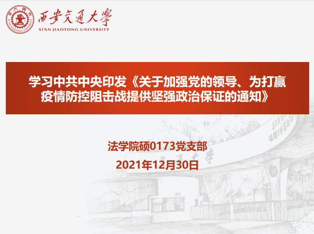 2021年12月30日,法学院硕0173党支部召开了线上组织生活会,专题学习中共中央印发《关于加强党的领导、为打赢疫情防控阻击战提供坚强政治保证的通知》(以下简称“《通知》”)。此次会议由党支部书记张雷奇主持,法学院副院长丁卫出席,党支部正式党员、预备党员、发展对象、入党积极分子参加学习。