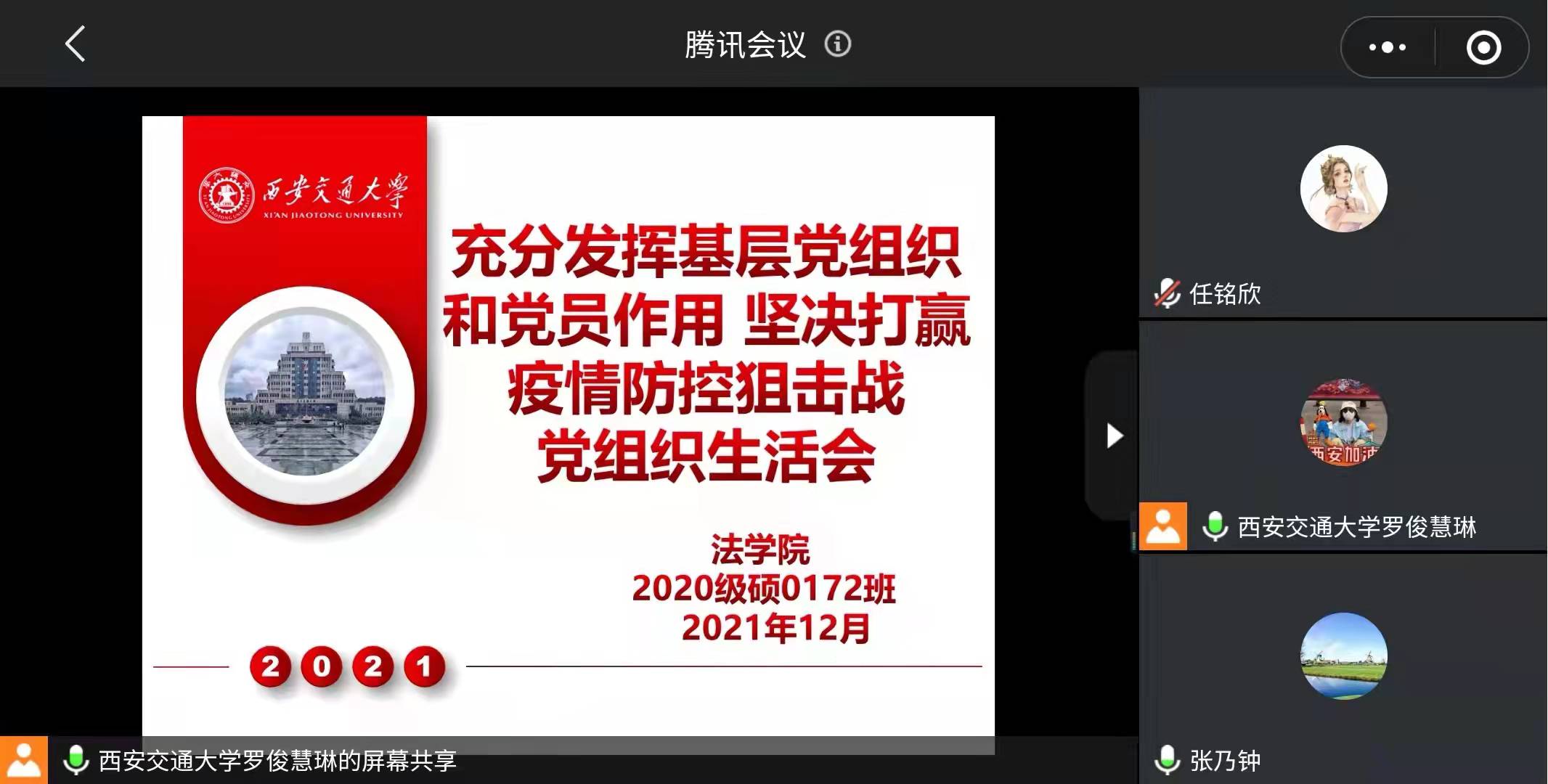 会议伊始,党支部书记罗俊慧琳向同学们谈到,虽然近来西安疫情严重,极大地影响了同学们的日常生活、科研。但正是在这样的时刻,我们才更应该不忘入党初心,严于律己、以身作则。在思想上提高政治觉悟,强化责任意识,坚持以集体利益为重;在行动上积极配合学院抗疫安排,主动参加各项志愿活动。同时,还要高度重视疫情封校宅寝期间自身及周围同学的心理健康,了解常见心理应激反应的表现,学习心理调解的小妙招,坚持健康的生活方式并带动周围同学,以积极的心态迎接抗疫胜利之日的到来。